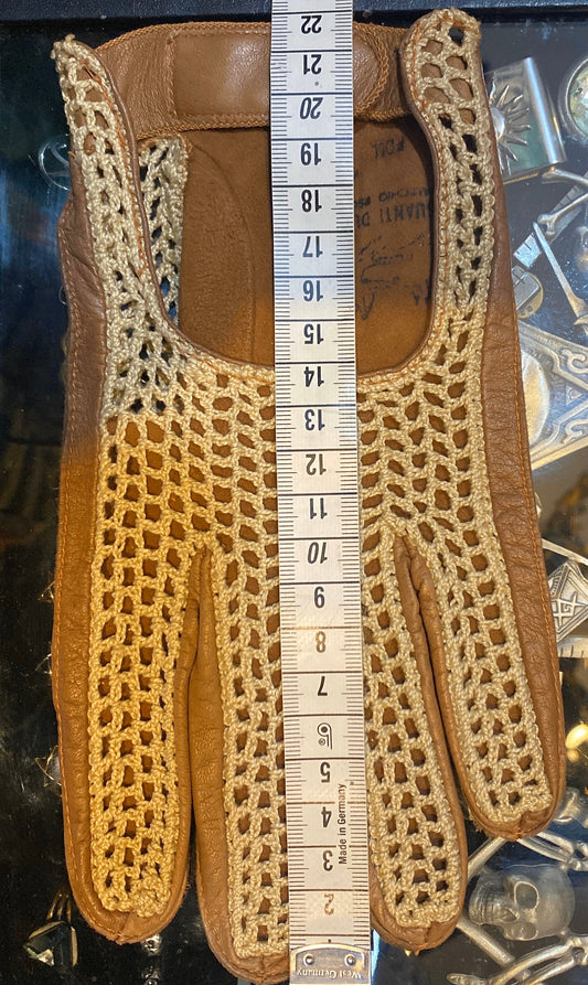 Vintage tan leather stringback driving gloves Due Lupi Millemiglia 80s made in Italy, Mint condition.