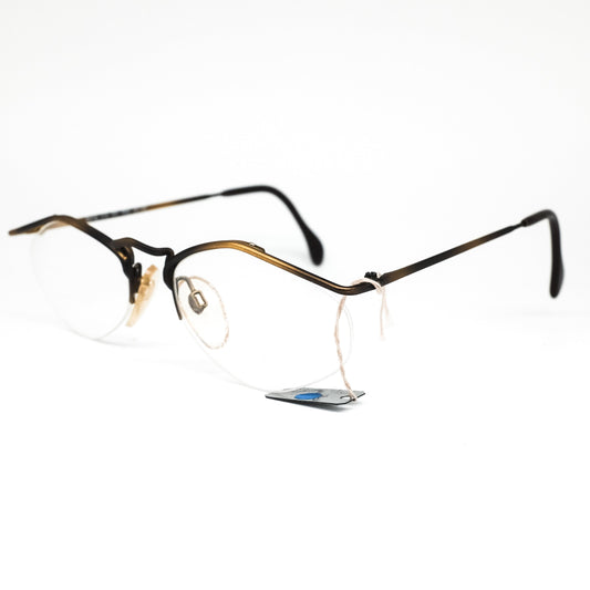 YABI-spirit minimal matt gold metallic eyeglasses frames in rimless design with pointing browline, 1980s NOS Germany.