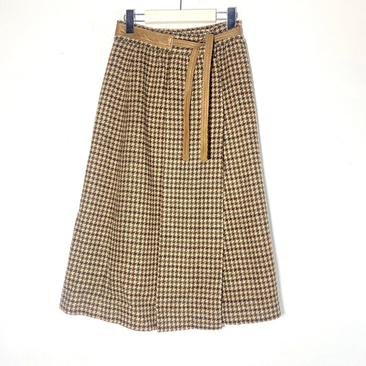 1970s NOS brown/beige houndstooth long wool skirt with leather strap, new with tags