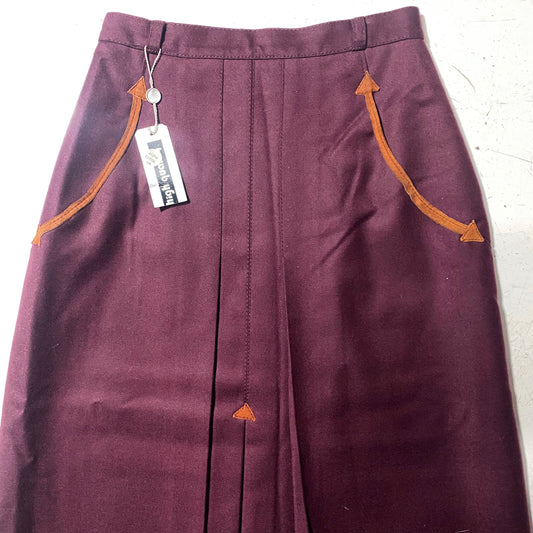 1970s NOS burgundy pure new wool skirt with brown suede details, made in Italy new with tags.
