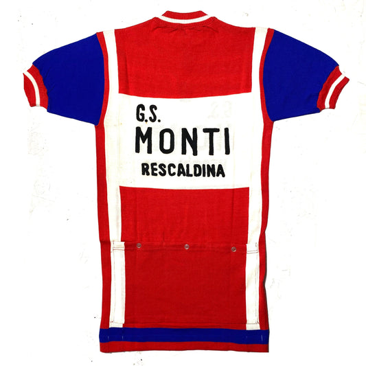 1970s Cycling Jersey GS Monti beautiful pattern blue/red/blue with appliqué lettering, mint