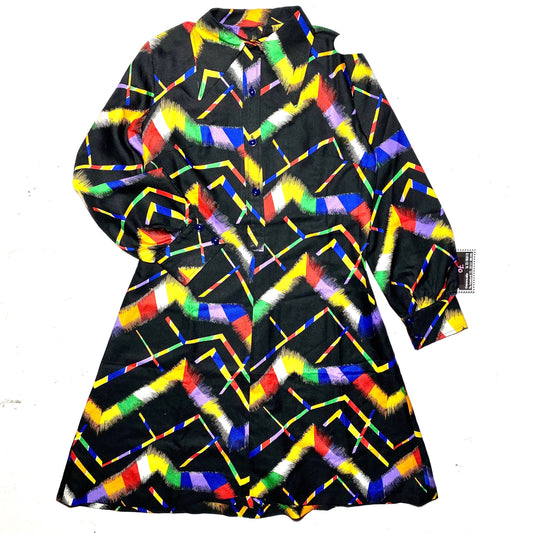 1970s MOd style satin shirt dress w/beagle collar, colorful abstract allover black base, perfect condition.