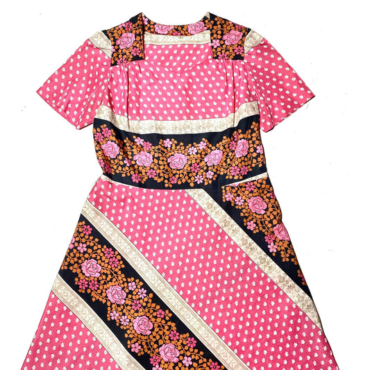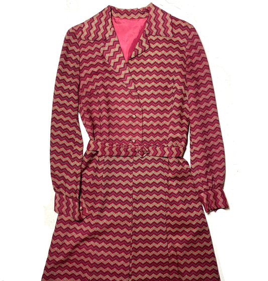 1970s burgundy cotton chevron allover dress with satin lining, matching belt, mint condition.
