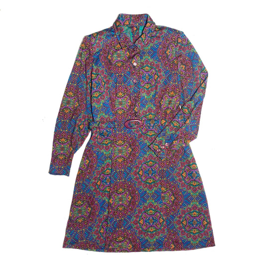 1970s colorful wool boho dress with a catchy purple/blue/green floral stylized pattern similar to tapestry, mint condition