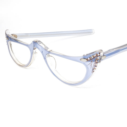 Agnes 1950s reading glasses, half moon shaped celluloid frames in tortoise or blue adorned by rhinestones, France NOS