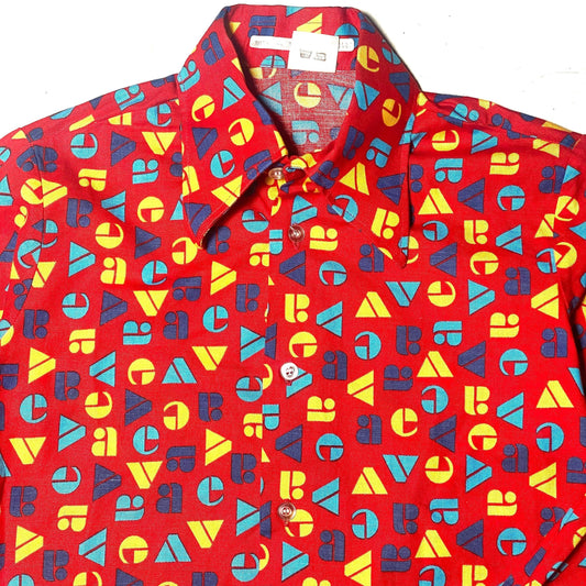 70s primary colors tapered collar shirt, red w/letters allover, kids size 152cm tall