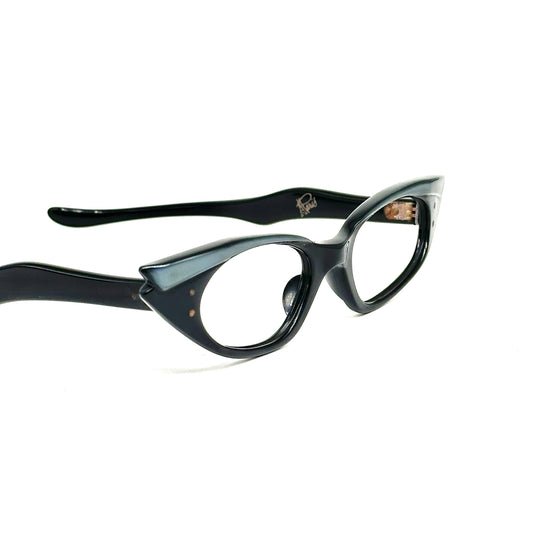A PARIS vintage black cateye glasses with emerald dark green eyebrow double pointed sides Made in France 1950s luxury style