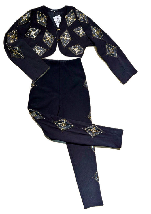 80s Paris couture set bolero and trousers in cotton/elast fully adorned w leather patches, studs & conchos, sz S/ 1