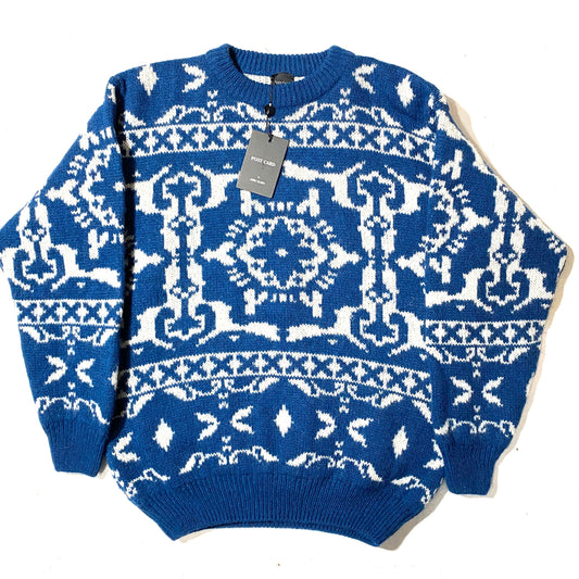 Post Card NWT 90s blue/white snowflakes and geometry all over wool Jumper, 80s NoS Italy
