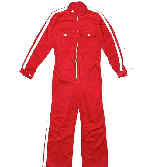 Cute red kids go-kart mechanic overall suit in cotton canvas with white stripe detail, NOS 70s