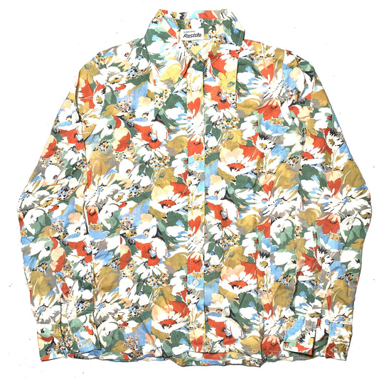 Resisto 1970s impressionist floral silk blouse w/beagle collar, made in Italy, sz 38, perfect