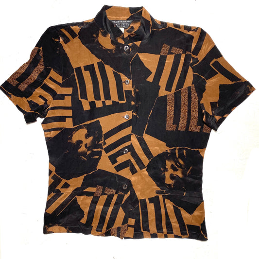 M.Burani Amuleti pure silk Blouse, Marlene Dietrich \ abstract allover, mint condition sz 46 Italy