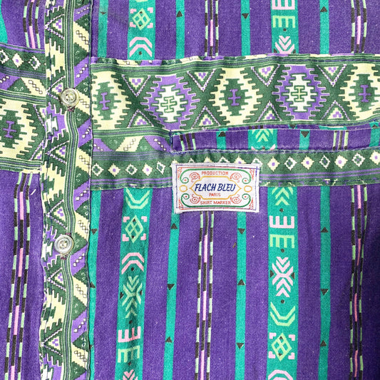 Flach Bleu Paris hip shirt purple/green navajo geometrical allover, 80s made in France great condition