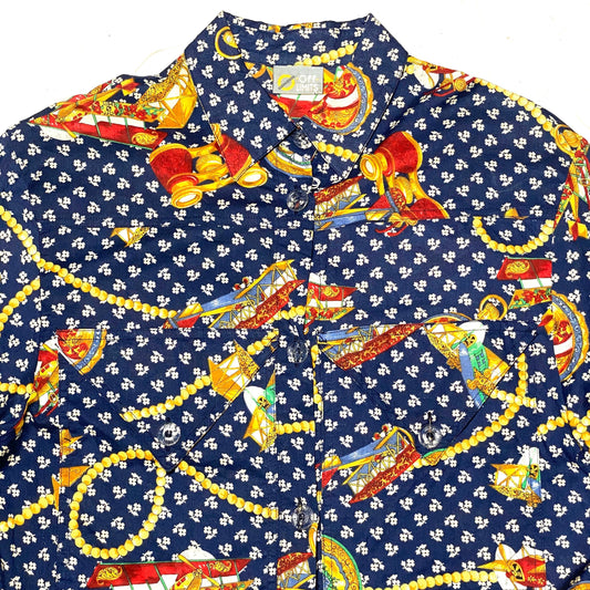 Off Limits blouse with coolest baroque allover of airplanes, pocket watches & teather goggles, 90s Italy sz42