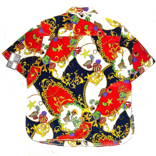 MissAstor satin baroque short sleeve shirt with chains / shells / sea stars allover, sz 42 mint condition