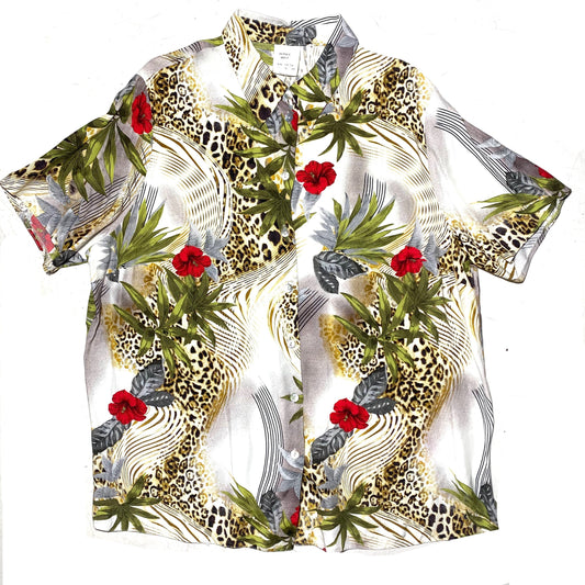 Cute cheetah / tropical flowers short sleeved shirt, size 46 L mint condition