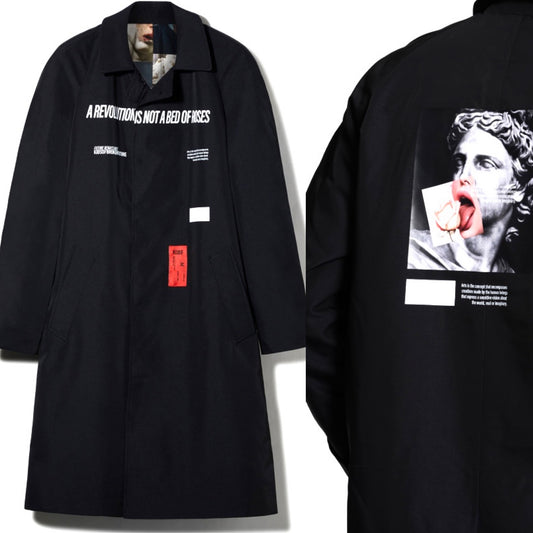 Kids of Broken Future “David” black Seaqual trenchcoat w neoclassical print cotton lining, S