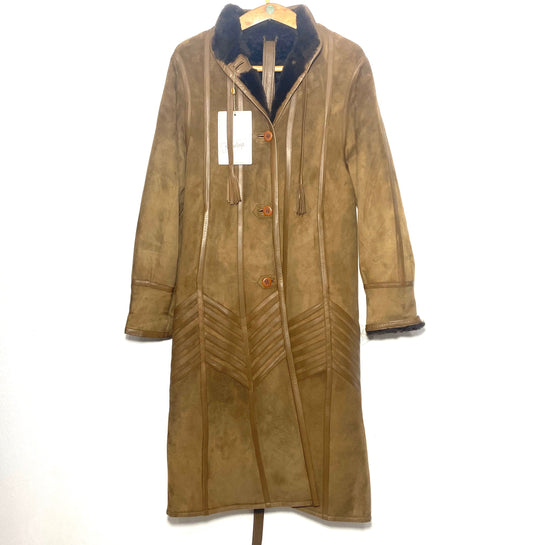 Luis Granada NWT brown suede shearling ladies coat, beautifully detailed with leather trimmings and fringed strap, Mint