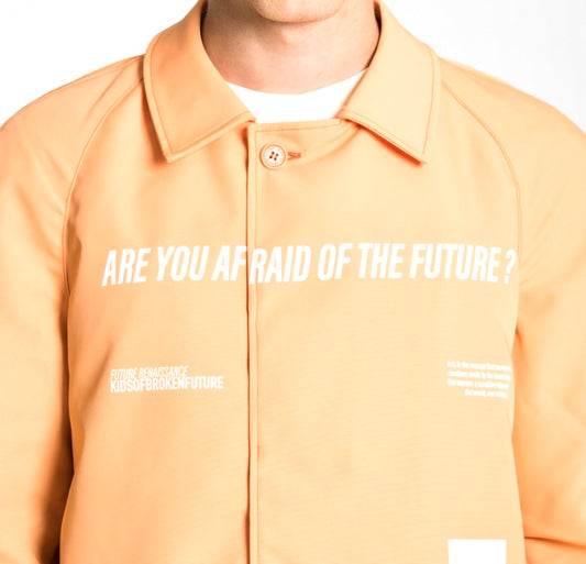 Kids of Broken Future “David” orange Seaqual trenchcoat w cotton neoclassical print lining, S