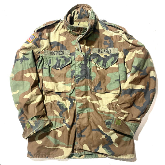 M65 Alpha Industries woodland camo military cotton canvas coat made in USA, 1981 issued piece with patches, S regular