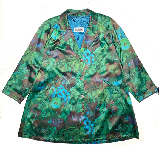 RainShop satin green floral / plants allover print rain trenchcoat, very light and fresh, Italy 90s Mint