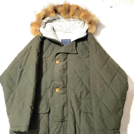 Outrage military green matelassè-quilted parka coat w fur hoodie, 1980s NOS with tags, mint