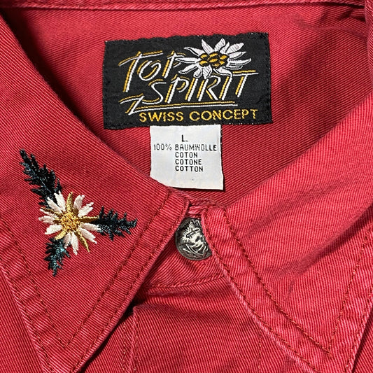 Top Spirit red cotton denim shirt with cute alps themed embroideries, cows, Alpine stars, in mint condition sz L