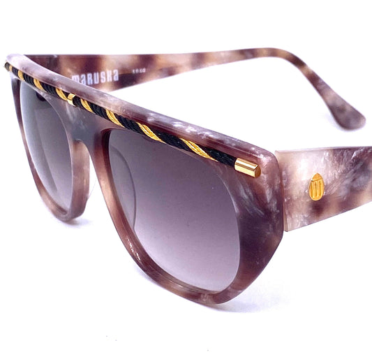 Luxury Maruska flat sunglasses marbled cello w detailed flat eyebrow inlaid rope, NOS 80s