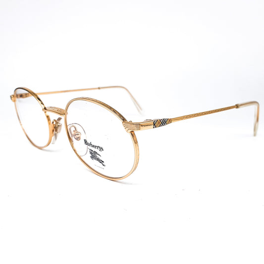 Burberrys B56-01 vintage modernist golden metallic oval eyeglasses frames with classic tartan on the temples, NOS 90s France
