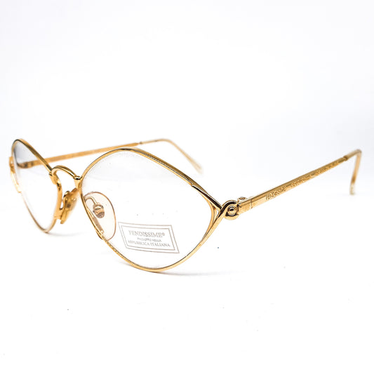Fendissime satin gold drop shaped lenses with pointing browline minimalistic eyeglasses frames made in Italy, 1980s NOs