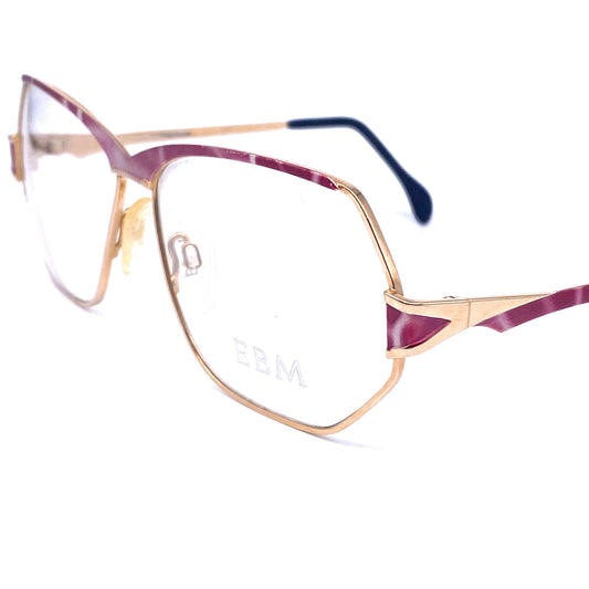 EBM oversized eyeglasses, modernist golden metal purple & pink arerographed frames. West Germani 90s NOS