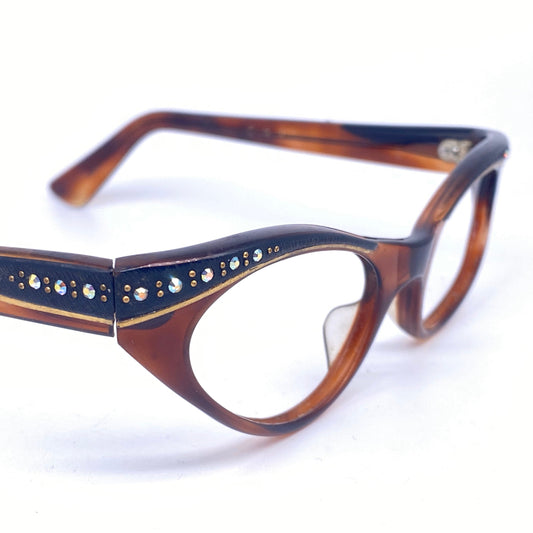 Black / Tortoise cateye eyeglasses frames with rhinestones and carved gold details, France 50s NOS