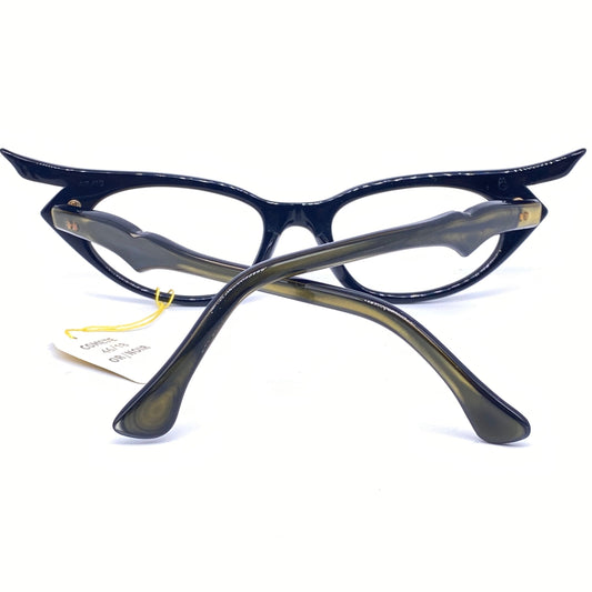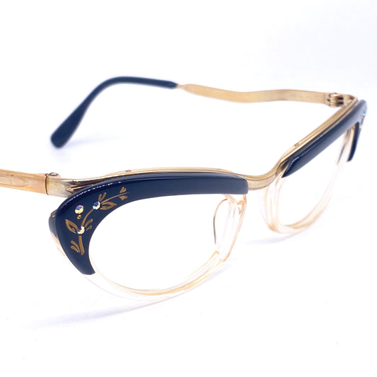 Stunning butterfly cateye eyeglasses frames, bicolor black/gold, 1950s NOS