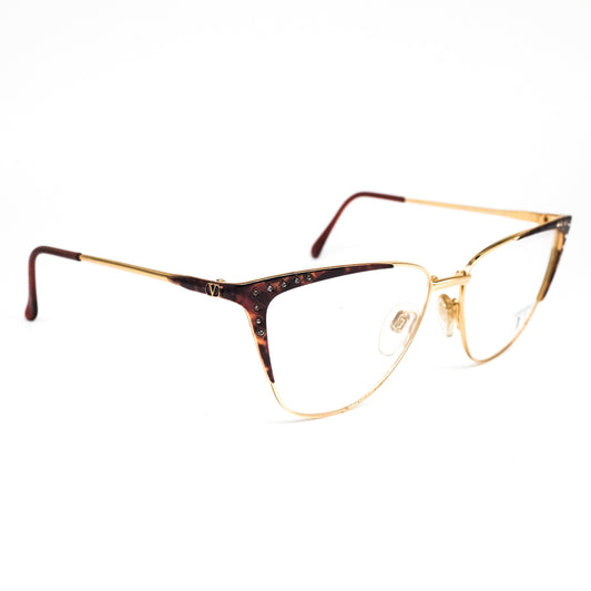 Valentino 357 golden cateye cello eyeglasses frames with brown tortoise enriched with rhinestone details, 1980s NOS