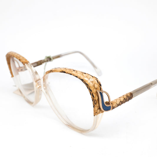 Maxim's de Paris rare clear acetate cateye eyeglasses frames with trimmed leather details. 80s NOS