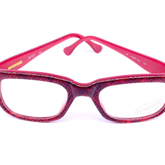 Missoni M107 iconic red chevron fabric inlaid square unisex frames, red base w black stripes, NOS 80s