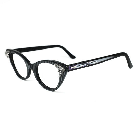 Shuron rare vintage black cateye eyeglasses frames with special hinge pins and temples design, USA 1950s NoS