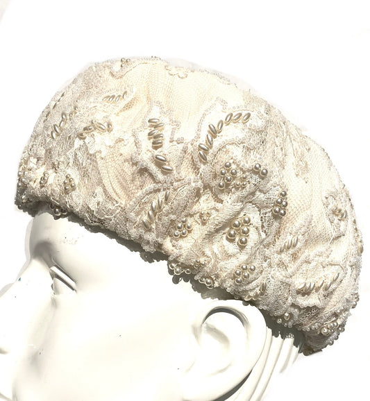 Ivory silk & tulle pillbox hat fully embroidered w floral motif of pearls of various shapes, NOS 80s Italy