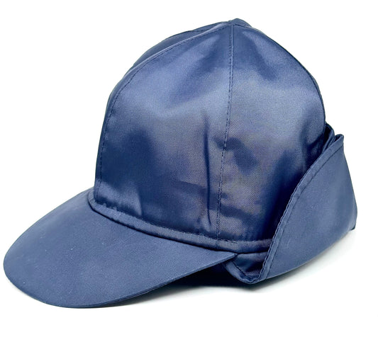 Sherlock Holmes style navy nylon hat with retractable wool knit earpads, NoS 80s Italy, sz 55, 56