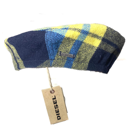 Diesel military style yellow/blue plaid wool beret / hat made in Italy, 90s NOS, 2 available