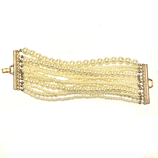 Bracelet w Faux Pearls, multiple lines of different sizes with brass mount, NOS 80s