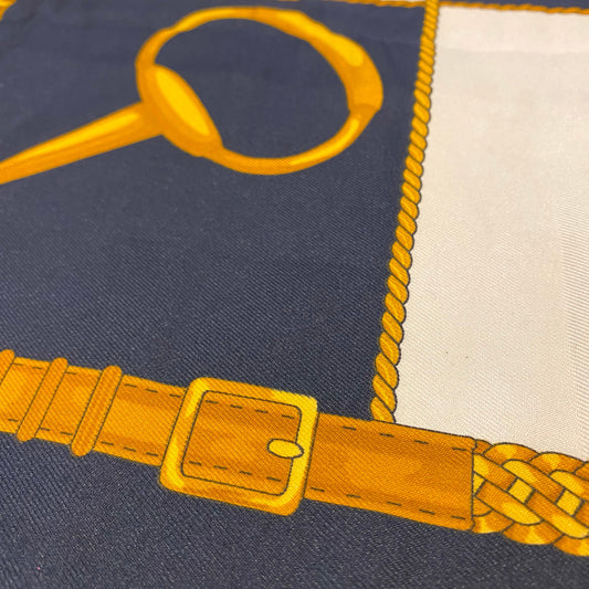 Gucci vibe navy / red satin scarf with leather straps and golden stirrups print, 80s mint condition