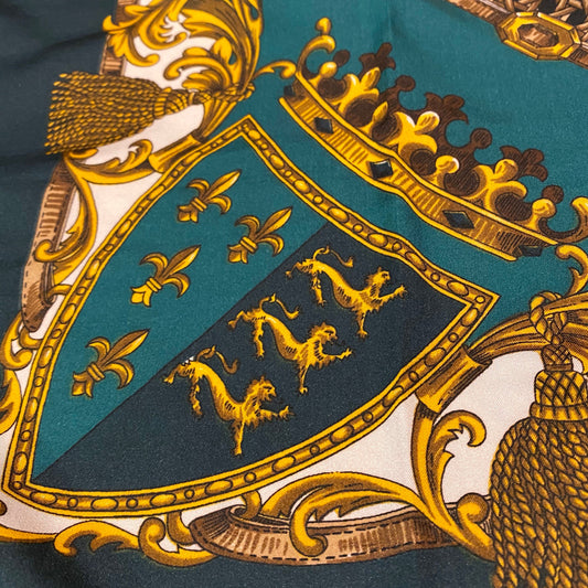 Pure silk hermes style green tones baroque royalty emblem scarf, 80s minty