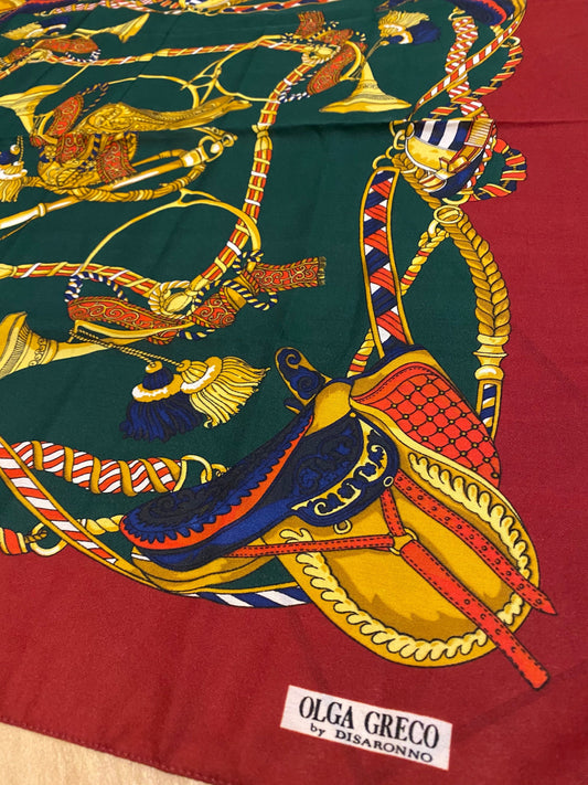Olga Greco satin baroque red / green hermes style royalty / chevalry print scarf, 80s minty