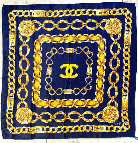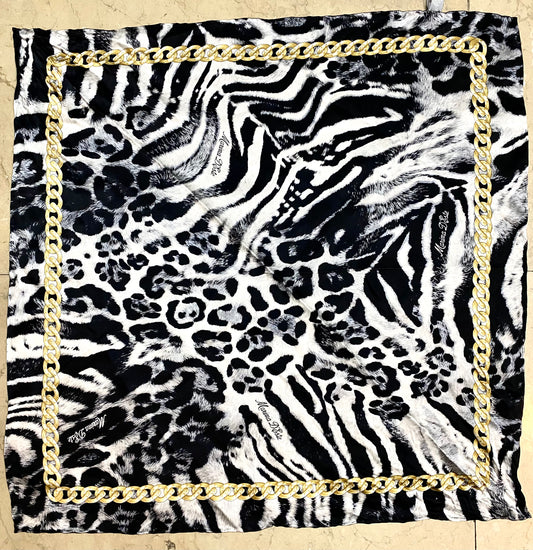 Marina D’Este B/W animalier print silk scarf w golden chain framing, BNWT