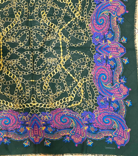 Gianni Versace early 80s huge 100% wool Green, golden baroque chains & purple flowers scarf, mint