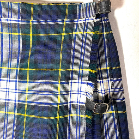Authentic UK made Scottish wool Blue plaid tartan plissed mini skirt with leather straps, mint condition size 10