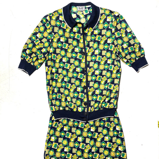 Liolà 2pcs polo/skirt set cotton dress with astology sun/moon/planets allover print, mint condition 80s Italy