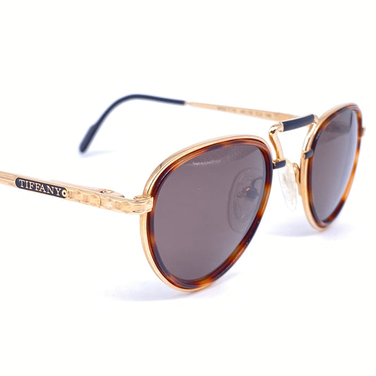 Tiffany T15 round hip sunglasses, 23k gold filled with tortoise rims, Italy 1980s NOS