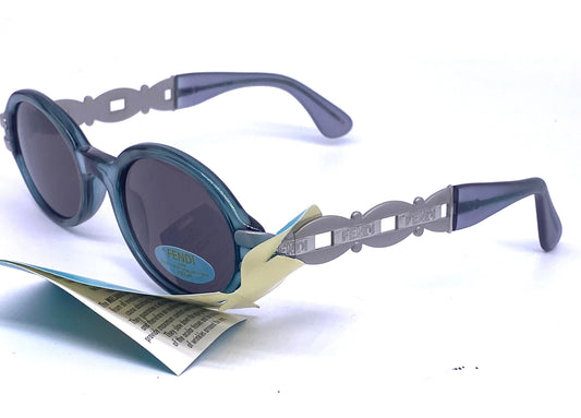 Fendi 90s hip oval sunglasses with chain styled temples carved logo, front in green or clear translucent cello, NOS Italy
